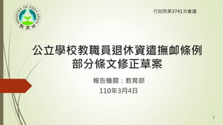 公立學校教職員退休資遣撫卹條例 部分條文修正草案 報告機關:教育部 110年3月4日 行政院第3741次會議 1