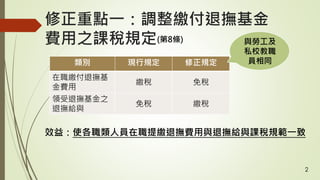 類別 現行規定 修正規定 在職繳付退撫基 金費用 繳稅