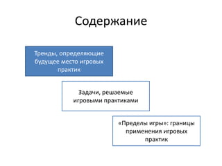 Документ обсуждает будущее игровых практик в контексте когнитивного мира, акцентируя внимание на интеграции виртуальной и реальной реальности, экономике заслуг, и тотальности образования. В нем рассматриваются тренды, такие как уменьшение границ между игровыми и реальными сценариями, а также различные форматы игр, которые будут востребованы в ближайшие годы. Кроме того, подчеркивается важность игры как инструмента для личностного и духовного роста.