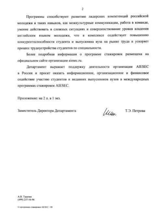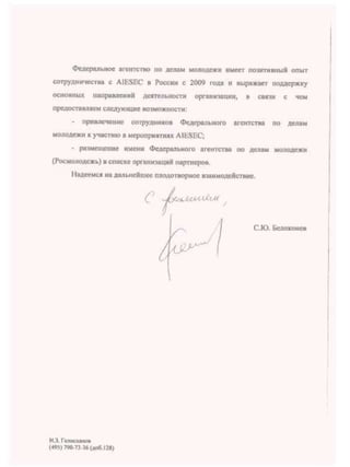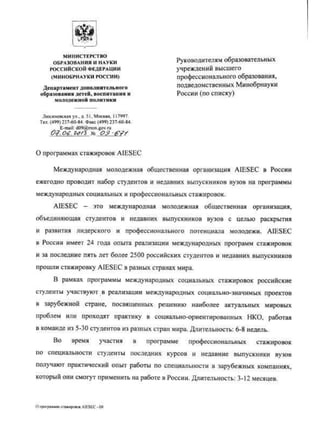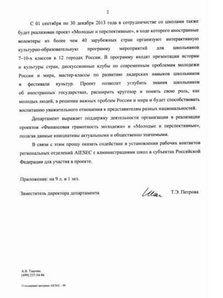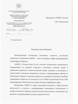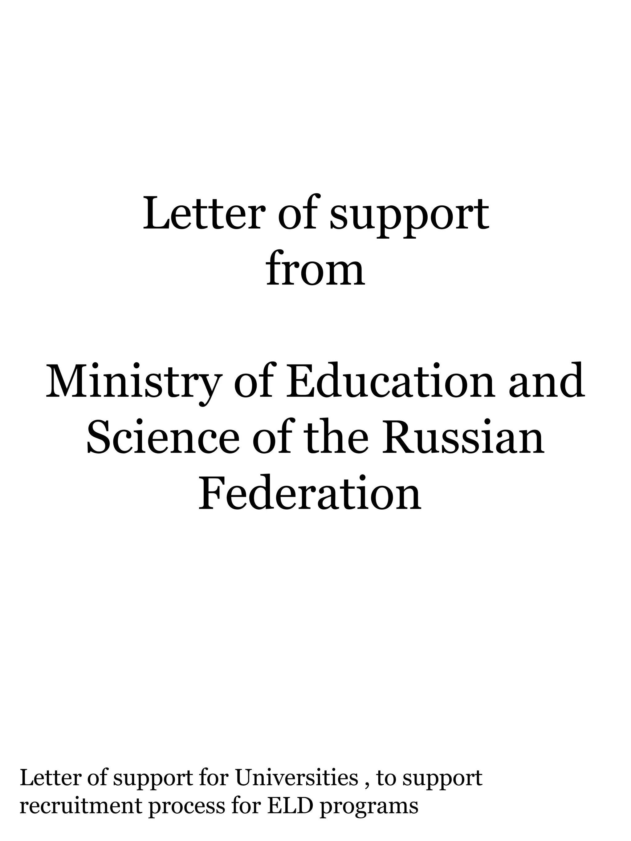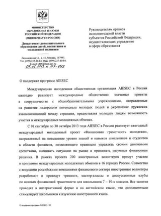 The document contains 4 letters of support from various government ministries and agencies in Russia. The first is a letter from the Ministry of Education and Science supporting universities' recruitment efforts for an ELD program. The second letter supports a financial literacy youth project addressed to regional education ministries. The third letter is from the Federal Agency of Youth Affairs supporting visa exceptions for incoming interns on GCDP projects. The fourth section lists local awards from Tomsk including a diploma for social projects on patriotism and civic engagement and a certificate from the Tomsk Education Department.