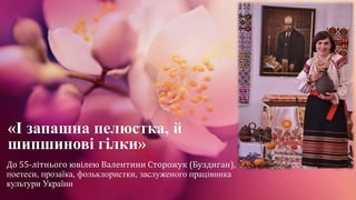 28 березня відзначає свій ювілей Валентина Сторожук – поетеса, прозаїк та фольклористка, краєзнавець, заслужений працівник культури України, лауреат обласної молодіжної премії ім. М. Трублаїні, літературних премій ім. М. Коцюбинського, Є. Гуцала, «Благовіст», ім. Марка Вовчка, ім. М. Стельмаха журналу «Вінницький край», ім. А. Бортняка. З нагоди ювілею письменниці фахівець відділу краєзнавства підготувала віртуальну виставку «І запашна пелюстка, й шипшинові гілки», яка знайомить усіх цінителів поетичного таланту з творчістю Валентини Сторожук.