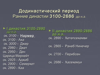Документ представляет собой хронологию древнего Египта, охватывающую различные династии и периоды, начиная с додинастического времени и заканчивая греко-римским периодом. Он включает в себя правление ключевых фараонов и временные рамки их династий, такие как I династия, Среднее царство и Новое царство. Также документ описывает смену власти и исторические события, происходившие в разные эпохи.