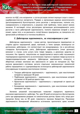 В статье рассматривается методика учета дебиторской задолженности, ее классификация и влияние на финансовую отчетность предприятия. Особое внимание уделяется организации аналитического учета расчетов с контрагентами, а также применению современных технологий для минимизации налоговых рисков. Авторы подчеркивают важность проверки добросовестности контрагентов и использования юридических инструментов для защиты от финансовых потерь.