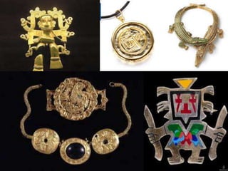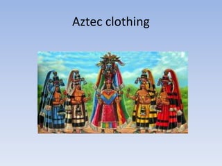 Aztec clothing varied depending on gender, age, social status, and occasion. Everyday dress for men consisted of a loincloth and cloak, while women wore a blouse and skirt. Children's clothing changed with age. Sandals indicated higher status. Hairstyles also differed by gender. Aztec people decorated themselves with gold, shells, and feathers to display wealth, with sumptuary laws restricting certain ornate styles to royalty. Warriors could earn honors through battle that allowed special costumes and beads, with higher ranks wearing jaguar or eagle costumes into combat.