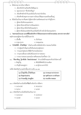 ข้อความในหมายเลข (๒) แสดงเจตนาของผู้พูดอย่างไร (๓) ข้อความในหมายเลข (๔) แสดงอารมณ์ของผู้พูดอย่างไร (๔) ลักษณะของอวัจนภาษาแบบใดที่ไม่ได้มีอยู่ในสถานการณ์ตัวอย่าง (๑) วัจนภาษาเพียงอย่าง เดียว (๒) เจตนาของผู้พูด (๓) อารมณ์ของผู้พูด (๔) อวัจนภาษาที่ไม่มีใน สถานการณ์ ก (๑) แสดงความเต็มใจ แสดงความไม่แน่ใจ สีหน้า ข (๒) แสดงความตกใจ แสดงความลังเล เครื่องแต่งกาย ค (๓) แสดงความไม่พอใจ แสดงการข่มขู่ อาการเคลื่อนไหว ง (๔) แสดงความไม่เต็มใจ แสดงความสุภาพ น้าเสียง ๑๘. ข้อใดไม่ใช่อวัจนภาษา ก. พี่เร่งเตือนเพื่อนชายพายกระโชก ถึงสามโคกต้องแดดยิ่งแผดแสง ข. กบิลพรหมตั้งปัญหาท้าธรรมบาล ให้กล่าวขานแก้ไขปัญหา ค. ถึงวัดแจ้งแสงจันทร์จารัสเรือง แลชาเลืองเหลียวหลังหลั่งน้าตา ง. อภิวันท์อัญชลีสี่นักเขียน ผู้ส่องเทียนนาทางสร้างวรรณศิลป์ จ. ตลิ่งเบื้องบูรพาศาลาลาน เรือขนานจอดโจษกันจอแจ ฉ. คาสัญญาที่ให้ไว้แต่ก่อน เหมือนสายลมอ่อนอ่อนผ่านไปมา ช. นาวาเอียงเสียงกุกลุกขึ้นร้อง มันดาล่องน้าไปช่างไวเหลือ ซ. วันครอบครัวพร้อมกันวันได้พบ วันประสบสังสรรค์ญาติผู้ใหญ่ ฌ. ถึงบางพูดพูดดีเป็นศรีศักดิ์ มีคนรักรสถ้อยอร่อยจิต ญ. แล้วชักเชือนชวนเพื่อนให้กลับหลัง ที่อื่นยังมีอยู่หลายคูหา ๑๙. ข้อใดเป็นวัจนภาษา ก. ฟังไม่ได้ศัพท์จับไปกระเดียด ข. พูดไปสองไพเบี้ย นิ่งเสียตาลึงทอง ค. ปากคนยาวกว่าปากกา ง. น้าท่วมทุ่งผักบุ้งโหรงเหรง จ. น้าท่วมปาก ฉ. น้าขุ่นไว้ใน น้าใสไว้นอก ช. ต่อความยาว สาวความยืด ซ. ขุดด้วยปาก ถากด้วยตา ฌ. กาแพงมีหู ประตูมีช่อง ญ. หน้าเนื้อใจเสือ คาชี้แจง ตอนที่ ๓ : ให้นักเรียนเลือกตอบคาตอบที่ถูกต้องที่สุดจากตัวเลือก ๑๐ ตัวเลือก