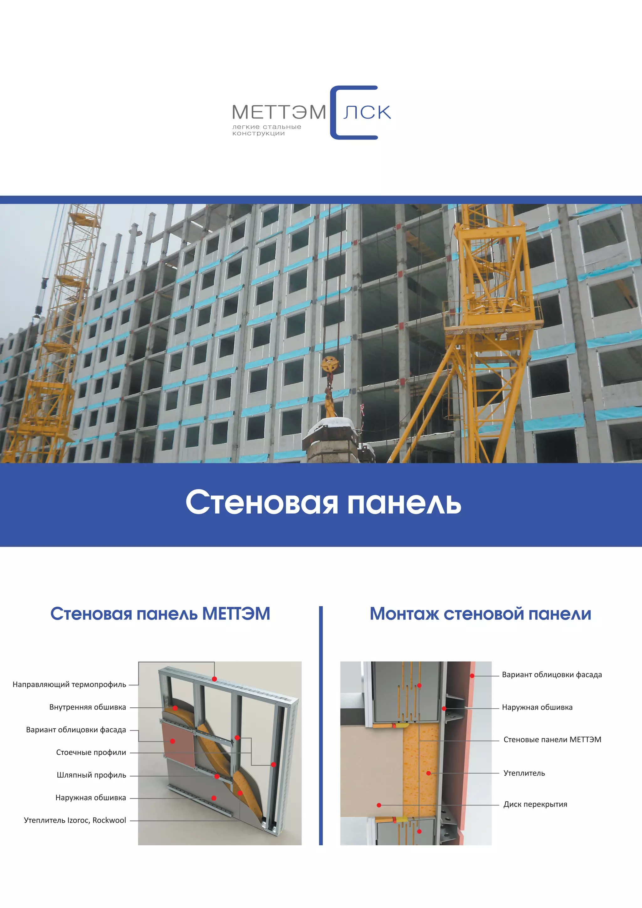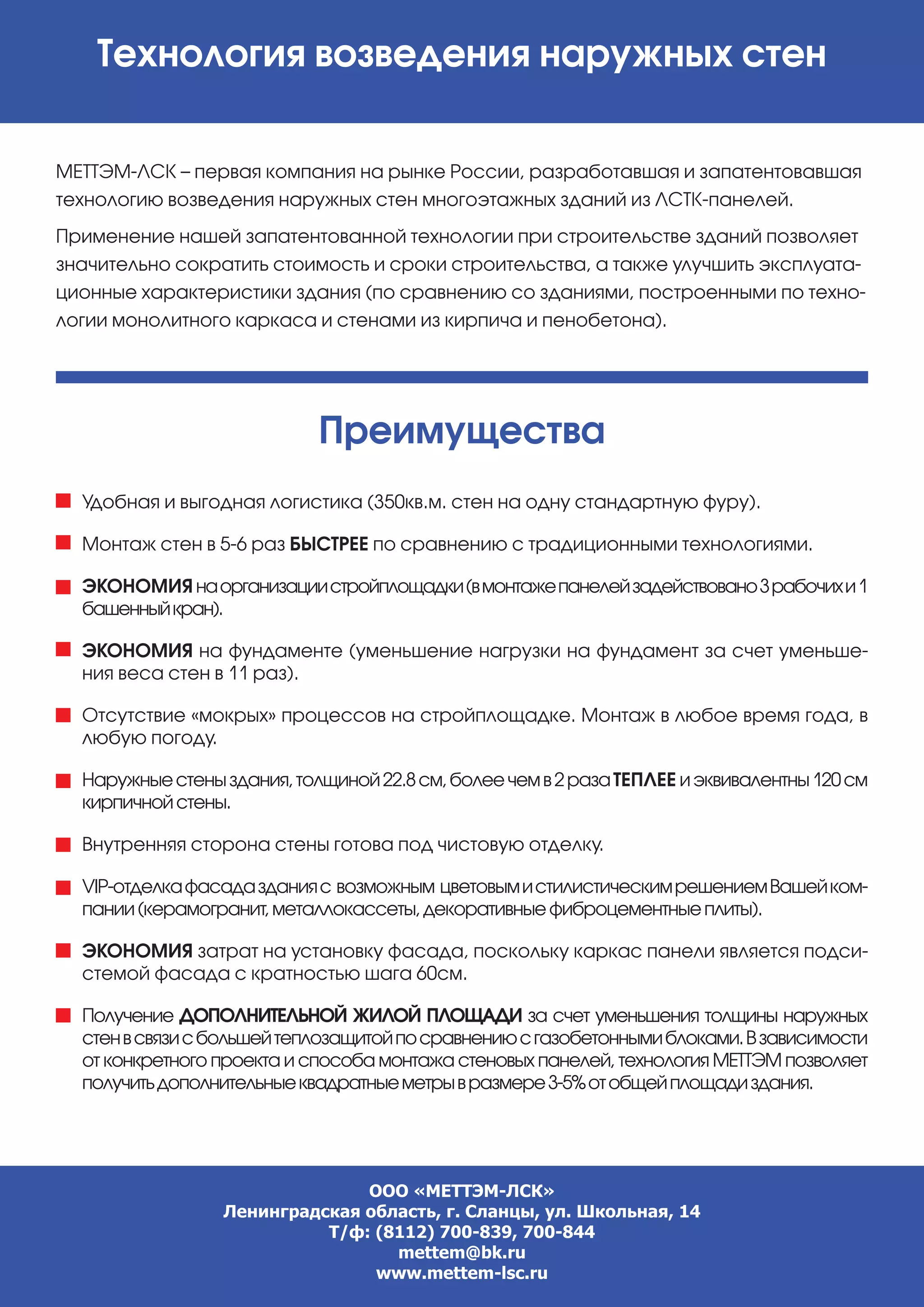 Документ описывает технологию возведения наружных стен многоэтажных зданий из лстк-панелей, разработанную и запатентованную компанией «меттэм-лск». Эта технология позволяет значительно сократить затраты и сроки строительства, а также улучшить эксплуатационные характеристики зданий по сравнению с традиционными методами. Также упоминаются преимущества монтажа, такие как легкость логистики, скорость установки, экономия на фундаменте и отсутствие «мокрых» процессов.