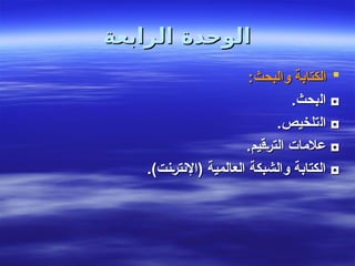الكتابة والبحث تشمل مجموعة من المهارات الأساسية مثل تلخيص المعلومات واستخدام الأساليب العلمية في الكتابة. يتناول المستند أيضًا أهمية اختيار موضوع البحث والتقنيات اللازمة لإجراء بحث فعّال. يشدد على أهمية تجنب الأخطاء الشائعة والاستفادة من الأبحاث السابقة في تطوير المهارات البحثية.