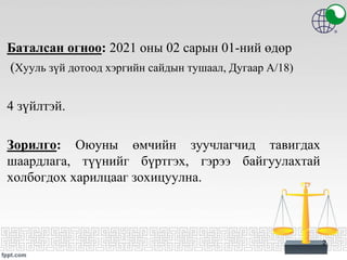 Similar to ОЮУНЫ ӨМЧИЙН ЗУУЧЛАГЧИЙГ БҮРТГЭХ ЖУРМЫН ТАНИЛЦУУЛГА