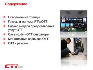 Документ обсуждает современные тренды и схемы монетизации OTT и IPTV-сервисов, включая плюсы и минусы каждой модели. Основное внимание уделяется растущему влиянию интернет-телевидения на традиционные услуги и способам удержания абонентов через новые интерактивные возможности. Приводятся конкретные примеры, такие как кейсы операторов из Турции и России, которые показывают важность гибридных OTT/ IPTV решений и разнообразных бизнес-моделей.