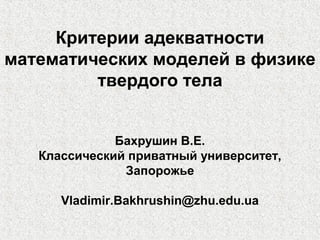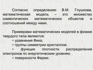 Документ рассматривает адекватность математических моделей в физике твердого тела, подчеркивая важность точности моделей для получения достоверных результатов. Он обсуждает источники погрешностей, такие как ошибки в исходных данных и вычислениях, а также методы проверки адекватности моделей, включая качественное и количественное соответствие. Важными этапами проверки являются анализ остатков и использование различных статистических критериев для определения надежности моделей.