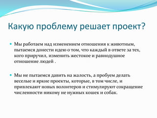 Проект «добрый город» направлен на изменение отношения к бездомным животным через создание позитивных и ярких инициатив, таких как фотосессии с известными личностями и граффити, вдохновляющие на заботу о животных. В числе задач организации «зоошанс» — привлечение внимания к проблемам безнадзорных животных и гуманное снижение их численности. Проект планирует сотрудничество с художниками и волонтёрами для реализации арт-объектов на улицах города.