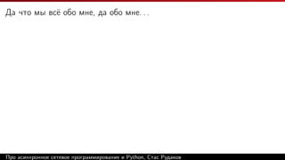 Документ обсуждает асинхронное сетевое программирование в Python с акцентом на библиотеки, такие как Twisted, Gevent и Tornado. Он охватывает различные аспекты, включая работу с транспортом и протоколом, использование callback и deferred для обработки асинхронных операций. Также документ рассматривает ключевые моменты, такие как PEP 3156 и примеры кода для иллюстрации эффективных подходов к асинхронному программированию.