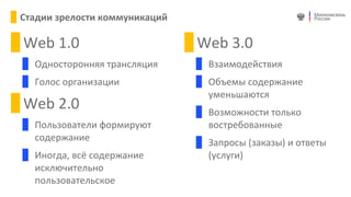 Документ представляет собой вводное слово, обсуждающее эволюцию коммуникаций от Web 1.0 до Web 3.0, где акцент сделан на изменениях в роли пользователей и их участия в контенте. Обсуждаются вопросы безопасности и идентификации пользователей, а также необходимость адаптивной системы управления доступом. Также упоминаются элементы информационной панели, такие как нотификации и инструменты для совместной работы.
