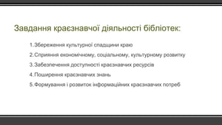 Завдання краєзнавчої діяльностібібліотек:
