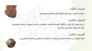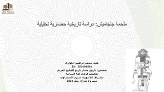 تناقش الوثيقة تحليل ملحمة جلجامش من منظور حضاري وتاريخي، حيث تعتبر من أقدم النصوص الأدبية وكتبت بالكتابة المسمارية. يستعرض البحث فكرة الخلود كما تظهر في الحضارات القديمة، ويشير إلى الشخصيات الأساسية في الملحمة والمفاهيم المرتبطة بالخلود في الثقافات المختلفة.