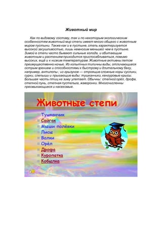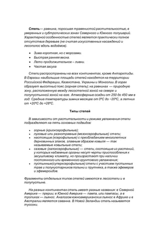 Степь представляет собой травянистую равнину, распространенную в умеренных и субтропических зонах, с характерным отсутствием деревьев и разнообразием растительных сообществ. Она делится на несколько подвидов в зависимости от растительности и климатических условий, с типичными зимними температурами от 0°C до -20°C и летними от +20°C до +28°C. Животный мир степи включает как копытных, так и грызунов, и характеризуется высокой засушливостью, где растения адаптированы к жестким климатическим условиям.