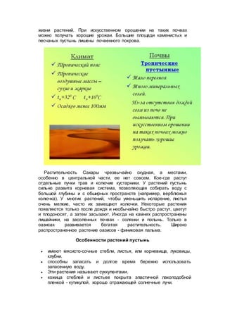Документ описывает тропические пустыни, включая их характеристики, растительность и животный мир, с акцентом на пустыню Сахару. Упоминается о механизмах адаптации растений и животных к суровым условиям, а также проблемах, связанных с расширением пустынь из-за неправильного ведения сельского хозяйства. Природные изменения приводят к значительным потерям сельскохозяйственных земель и бедности местного населения.