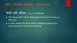 There is a description regarding the Shareera definition, synonyms, shadanga shareera, difference between shareera, shaareera and shareeri, shava chedana vidhi and mahatva, definition of purusha, different types of purusha.