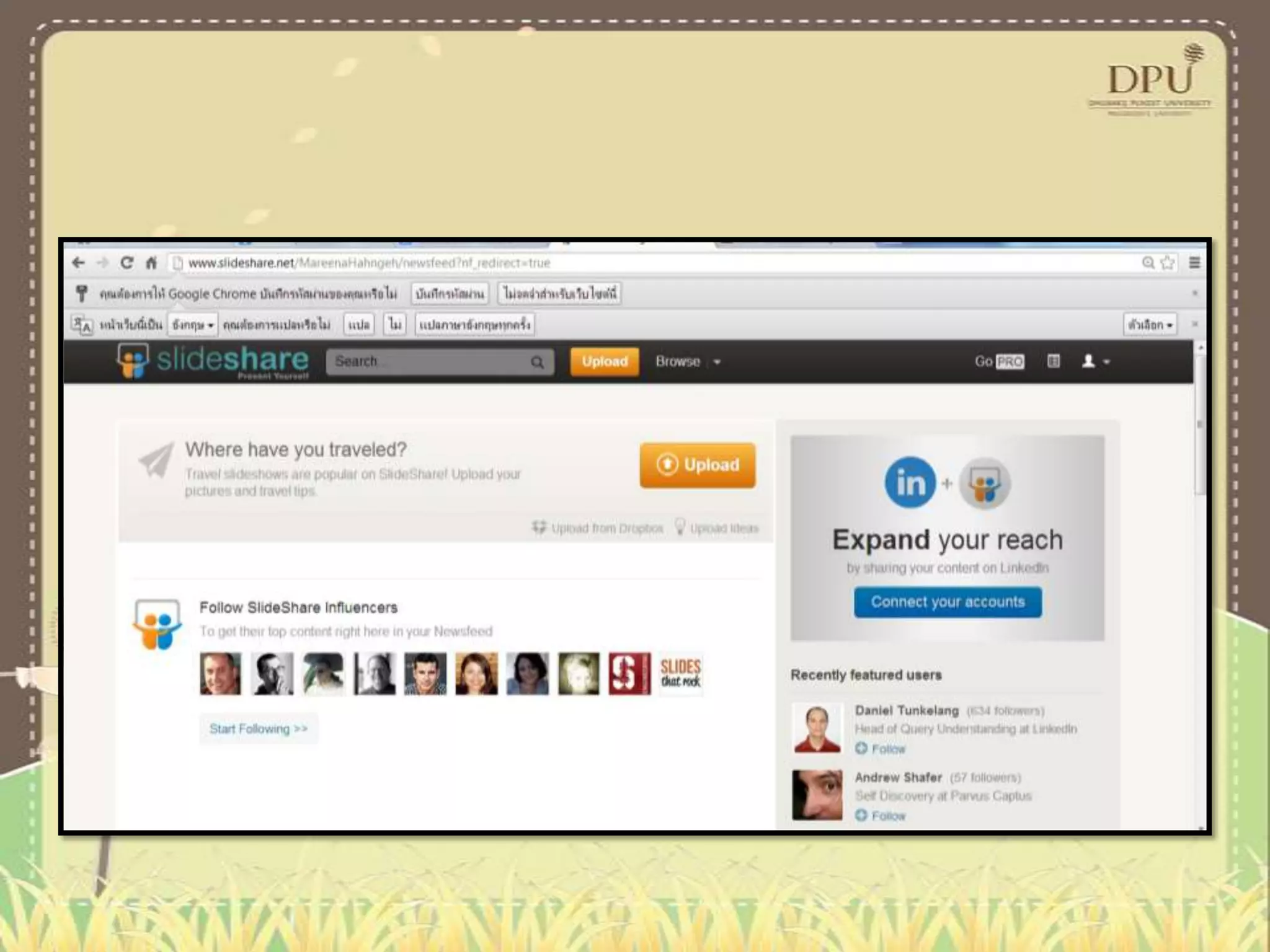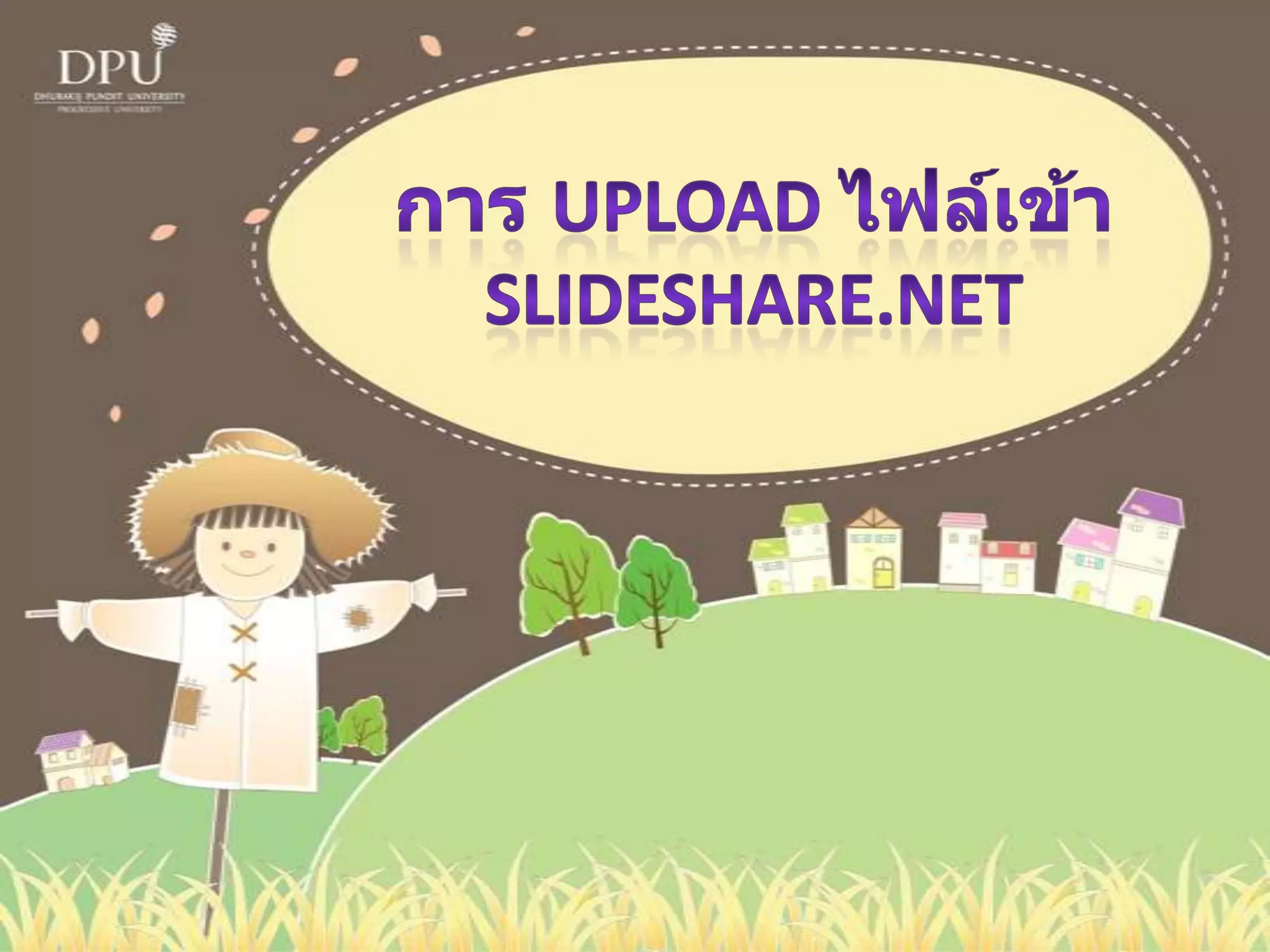 This document provides instructions for uploading a presentation to the website www.slideshare.net. It outlines logging in with a username or email, uploading PowerPoint, PDF or other file formats, and then viewing and sharing the uploaded presentation online where others can see it. The presentation will be publicly visible once uploaded.