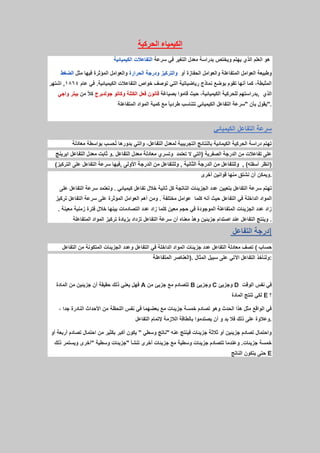 تتناول الوثيقة دراسة الحركية الكيميائية، التي تركز على العوامل المؤثرة في سرعة التفاعلات الكيميائية مثل الضغط ودرجة الحرارة والتركيز. تقدم الوثيقة نماذج رياضية لقياس معدل التفاعل وتعتمد على مبادئ تجريبية وقوانين معينة لتحديد السرعة. ترتبط سرعة التفاعل بتركيز المواد المتفاعلة وعدد التصادمات بينها خلال فترة زمنية محددة.