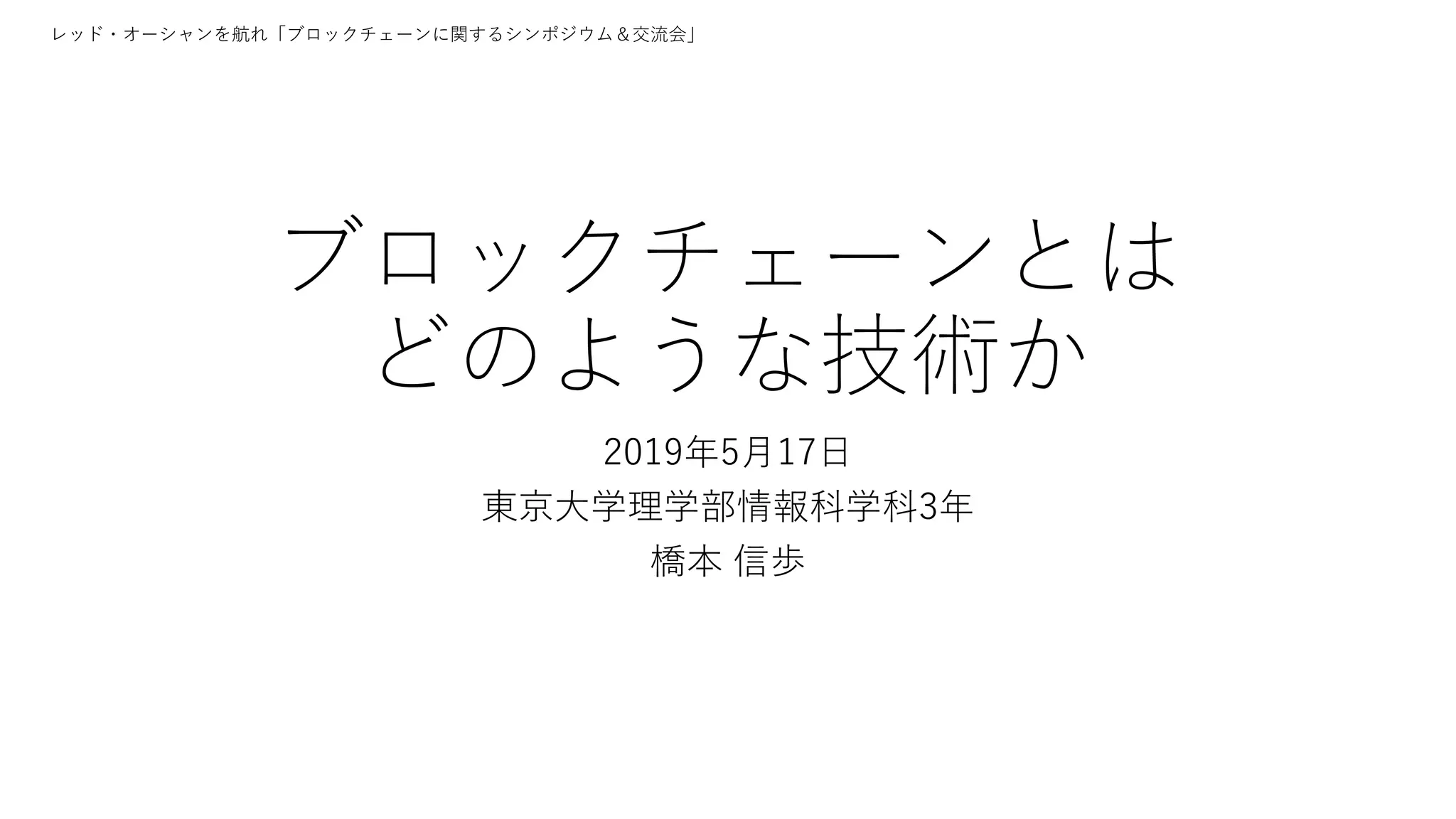 ブロックチェーンの基礎的な知識や応用先などについてのスライドです。 「ブロックチェーン社会に関するシンポジウム&交流会」における基調講演資料です (2019/05/17)。 プロフィール: https://n-hassy.info/ja/