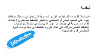 يتناول المستند كيفية اتخاذ القرارات الصائبة من خلال فهم الأهداف والمقارنات بين الإيجابيات والسلبيات. يشدد على أهمية وضع الأولويات واستشارة الآخرين للحصول على دعم في عملية اتخاذ القرار. كما يناقش كيفية التعامل مع التعقيدات والأسباب المحتملة وراء القرارات الخاطئة.