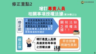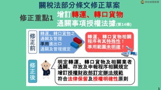 此文档总结了有关转运和转口货物通关的管理修订,强调财政部关务署针对相关流程和程序的授权及规定。主要修正包括提高违反规定的罚款上限、强化自主管理的责任和引入物联网监控系统以确保货物安全。修订旨在提升管理强度,维护边境秩序及国内治安。