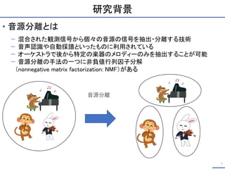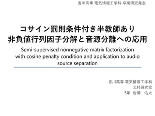 1) The document discusses a semi-supervised nonnegative matrix factorization method with a cosine penalty condition for audio source separation.