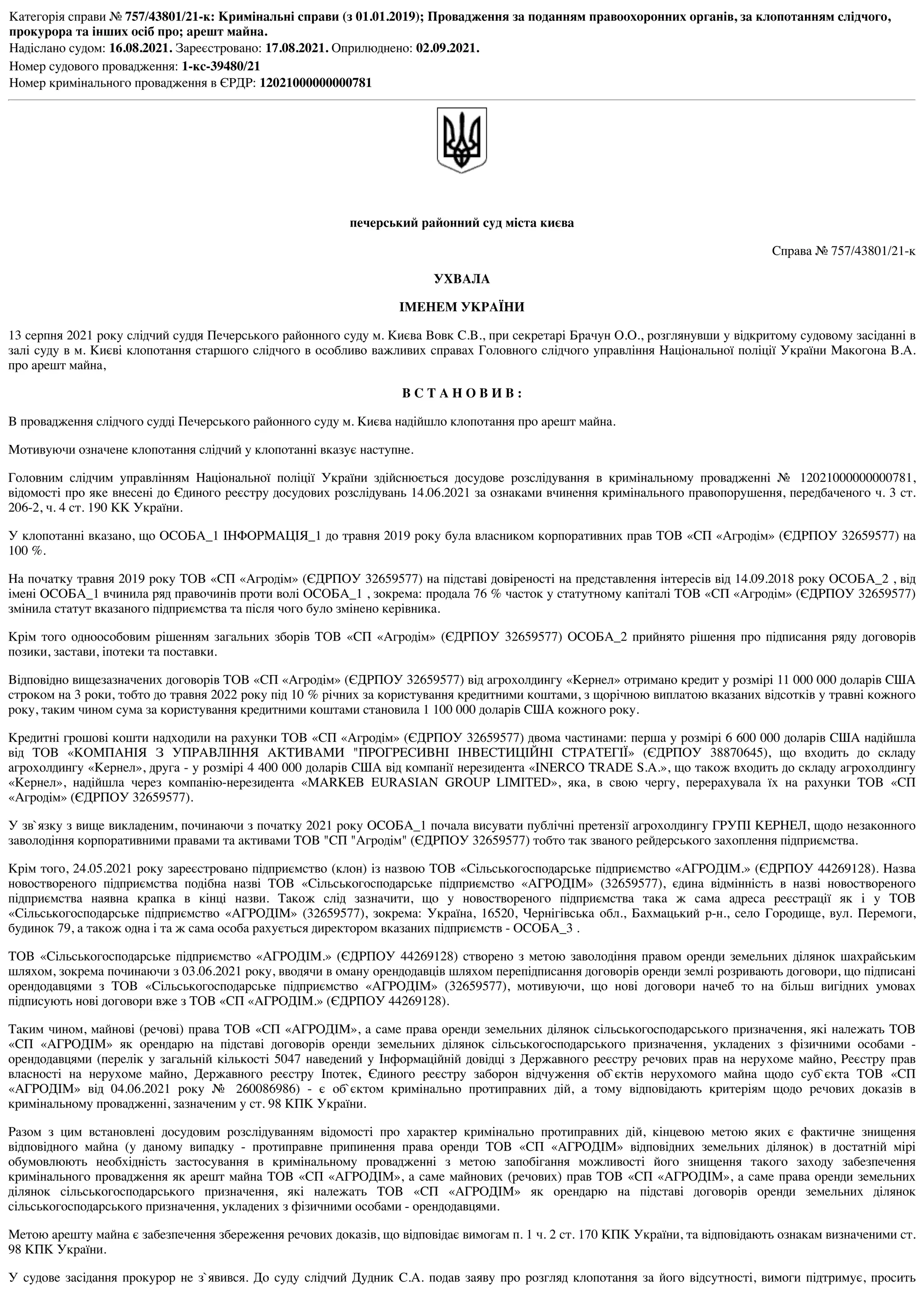 заволодіння корпоративними правами та активами ТОВ "СП "Агродім" (ЄДРПОУ 32659577) тобто так званого рейдерського захоплення підприємства.
