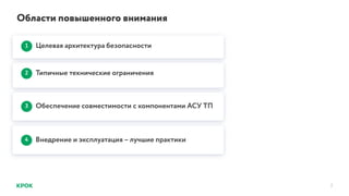 Документ описывает ключевые аспекты создания защиты автоматизированных систем управления технологическими процессами (Асу ТП), включая целевую архитектуру безопасности и технические ограничения. Подробно рассматриваются проблемы совместимости компонентов и важные практики внедрения и эксплуатации защитных средств. Освещаются вопросы модернизации инфраструктуры и требования к ее адаптации для повышения надежности защиты.