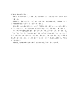 母親の仕事の内容を聞いて 母親は、家で仕事をしていますが、どんな仕事をしているのか知らなかったので、聞い てみました。 話を聞くと、文章の校正や、インスタグラムやツイッターの文章作成、YouTube のシナ リオや動画作成などをしていることがわかりました。 何の仕事をしているか知らなかったけど、今回初めて知りました。そして色々な仕事を しているということ、色々な会社から請け負っているということがわかり、驚きました。 インスタグラム用の文章を書くときにどんなことに気を付けているのか聞いてみると、 「そのブランドのイメージに合う文体にするように気をつけている」とのことでした。そ して、 「誰にでもわかりやすいような文章で、魅力を伝えられようにすること」 「写真を邪 魔しないようにすること」にも気を付けているのだそうです。私はそれを聞いて、大変だ なと思いました。 私も将来、家で働きたいと思います。会社より家の方が落ち着くからです。