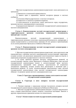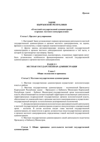 Проект закона Кыргызской Республики регулирует организацию деятельности местной государственной администрации и органов местного самоуправления, определяя их полномочия, задачи и функции. Основное внимание уделяется принципам законности, социальной справедливости и взаимодействия с гражданами. Закон также устанавливает порядок назначения и ответственности акимов, а также их полномочия в рамках местного управления.