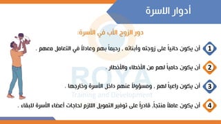 يتناول الوثيقة أدوار الأسرة في العلاقة الزوجية، حيث يبرز أهمية التعامل الحاني والرحيم بين الزوجين وضمان توفير احتياجات الأسرة. كما يوضح أنواع العلاقات الزوجية وصفات الأسرة الناضجة، بالإضافة إلى استعراض العوامل والمشكلات التي تؤثر على العلاقات الأسرية. ويناقش كيفية مواجهة هذه المشكلات وضرورة التعاون والتفاهم بين الزوجين لضمان حياة أسرية مستقرة.
