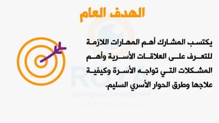 يتناول الوثيقة أهمية العلاقات الأسرية والحوار كوسيلة لتعزيز الروابط بين أفراد الأسرة. ويقدم توجيهات تدريبية لمساعدة الأسر على تحسين تواصلها وفهم مشاعر بعضها البعض. كما يسلط الضوء على أنواع الحوارات التي يمكن أن تساهم في بناء أسر سعيدة ومستقرة.