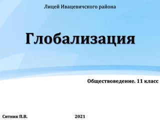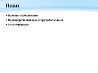 Документ освещает концепцию глобализации как процесса сближения стран через экономические, политические и культурные связи, а также ее противоречивый характер, включая аспект антиглобализма. Рассматриваются позитивные и негативные последствия глобализации, включая неравномерное экономическое развитие и культурную универсализацию. Также документ выделяет требования движения антиглобалистов, направленные на создание социально ответственной глобализации и защиту прав работников.
