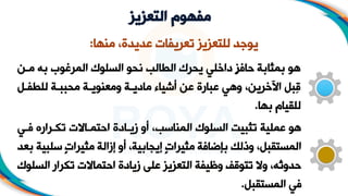 يتناول الوثيقة أهمية التعزيز في التعليم وتأثيره على دافعية المتعلم وسلوكه الإيجابي. يُشير إلى أن التعزيز يمكن أن يكون إيجابي أو سلبي، وله أنواع متعددة مثل التعزيز اللفظي والمادي. كما تأكد الوثيقة على ضرورة استخدام استراتيجيات فعالة لتعزيز سلوكيات المتعلمين وتحقيق الأهداف التعليمية.
