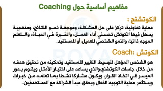 تتناول الوثيقة مفاهيم وأساسيات الكوتشينج، مشيرة إلى دور الكوتش كمدرب يهدف إلى تحسين أداء الأفراد والمجموعات عبر استراتيجيات تعاونية. توضح الوثيقة مستويات الكوتشينج المختلفة وتفاصيل الأنواع المتعددة له، مثل الكوتش الروحي وكوتش العلاقات. كما تتطرق إلى المبادئ الأساسية والتقنيات المستخدمة في العملية، مع التأكيد على أهمية الأمانة والمصداقية في العلاقة بين الكوتش والمتدرب.