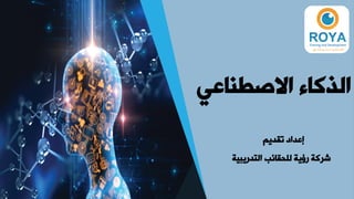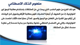 يتناول الوثيق مفهوم الذكاء الاصطناعي وأهدافه وخصائصه في مجال علوم الحاسب، بالإضافة إلى أهميته في مجالات متعددة مثل الطب والعسكري والتصميم. يبرز document مكونات الذكاء الاصطناعي الأساسية مثل المعرفة وقواعد البيانات وآليات الاستدلال، ويعرض اتجاهات البحث في الذكاء الاصطناعي وتركيزه على محاكاة الذكاء البشري. يسعى الذكاء الاصطناعي إلى تحسين قدرات الأجهزة في معالجة المعلومات وحل المشكلات المعقدة.