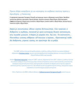 Кафки, Томасу Вулфу и Марселу Прусту,каои значајну студију Поетикабајке.Објавилаје и студију