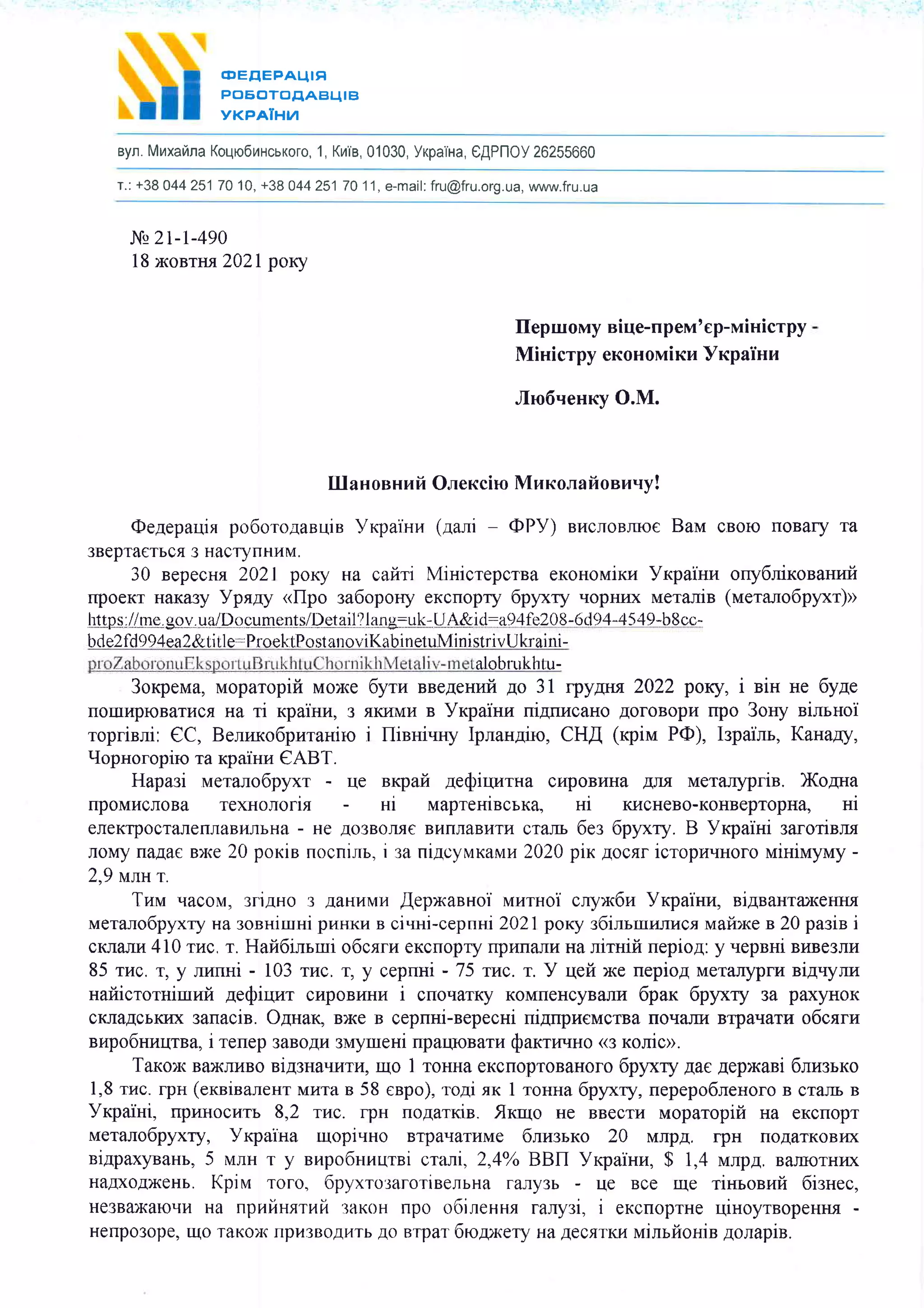 Лист до першого віцепрем’єр-міністра, міністра економіки Олексія Любченка від Федерації роботодавців України