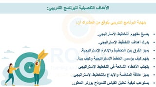 تتناول الوثيقة مفهوم التخطيط الاستراتيجي وأهميته في صياغة أهداف المؤسسات وتجنب الأخطاء الشائعة فيه. كما تفرق بين التخطيط الاستراتيجي والتخطيط التشغيلي، وتناقش دور الإبداع في تعزيز المنافسة والقدرة على التكيف مع التغيرات البيئية. كذلك، تعرض العقبات التي تواجه التخطيط الاستراتيجي وكيفية التغلب عليها لتحقيق الفعالية والكفاءة في الإدارة.