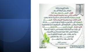 يتحدث النص عن أهمية العقيدة في الإسلام، موضحًا الأركان الأساسية للإسلام والإيمان من خلال حديث جبريل الشهيرة. يتطرق أيضًا إلى دلائل وجود الله، مثل الطبيعة والكون، وكيف تعكس حكمته وقدرته. يستعرض النص معتقدات أهل السنة والجماعة حول الإيمان والتوحيد.