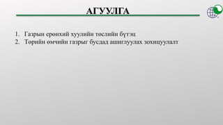 Similar to ГАЗРЫН ЕРӨНХИЙ ХУУЛИЙН ТӨСӨЛ ДЭХ “ГАЗАР АШИГЛАХ ЭРХ”-ИЙН ТУХАЙ