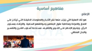 يتناول الوثيقة أسس ومهارات الإعلام ووسائل التواصل في إعداد المواد التدريبية، مع التركيز على أهمية الصدق والشفافية في التواصل مع الجمهور. كما يستعرض أنواع الوسائل الإعلامية المستخدمة في نشر المعلومات، مع أهمية التفكير النقدي وفهم المحتوى من قبل المراسلين. يُبرز الوثيقة ضرورة التحضير الجيد والأسئلة اللازمة خلال المواقف الصحفية لضمان فعالية الرسالة الإعلامية.