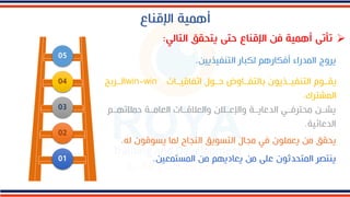 تقدم الوثيقة رؤية شاملة حول مهارات الإقناع والتأثير، وتركز على إعداد الحقائب التدريبية اللازمة لذلك. تسلط الضوء على عناصر الإقناع الأساسية مثل الثقة والمهارات الإنسانية، وتصف استراتيجيات وأساليب لتحقيق النجاح في التأثير على الآخرين. تتناول أيضًا أهمية البحث والاستماع كمهارات ضرورية في هذا السياق.