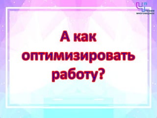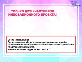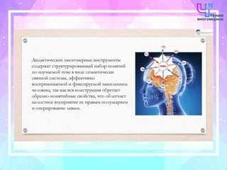 Документ содержит информацию о педагогическом семинаре, направленном на внедрение инновационных методов обучения, таких как технология многомерного чтения. В нём рассматриваются различные подходы к преподаванию, включая использование современных технологий и методов активного обучения для повышения интереса детей к учебному процессу. Также представлена обратная связь от участников семинара, подчеркивающая важность этих методов для развития творческого мышления учащихся.