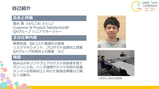 & Product Satisfaction部 QAグループ シニアマネージャー 障害削減、QAコスト最適化の推進 リスクマネジメント、プロダクト品質向上提案 QAグループ技術向上の推進 など 組み込み系ソフトウェアのテスト技術者を経て グリーに入社。ベンダ連携やテスト内容の改善、 メンバーの技術向上に向けた勉強会開催など幅 広く活動中。 CEDECに過去4回登壇