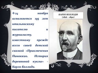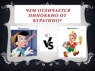 Документ сравнивает персонажей итальянской сказки 'Пиноккио' Карло Коллоди и русской версии 'Буратино' Алексея Толстого, подчеркивая их отличия в сюжете и характеристиках. Пиноккио сталкивается с моральными уроками и трудностями, в то время как Буратино живет более легким и приключенческим путем без назидательности. В итоге, обе истории имеют схожую мораль о преодолении зла, но различаются по стилю и содержанию.