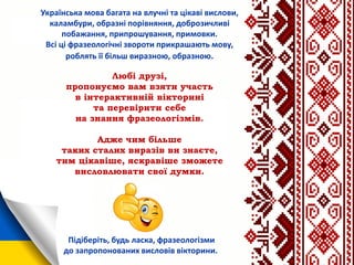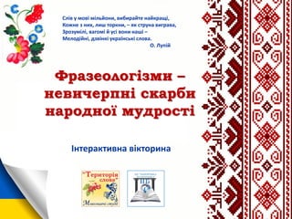 ✨До вашої уваги інтерактивна вікторина «Фразеологізми – невичерпні скарби народної мудрості», яка знаходиться на сайті бібліотеки за посиланням: https://tinyurl.com/4vj45f65