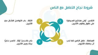 الوثيقة تناقش فن التعامل مع الناس وتقدم مبادئ النجاح في هذا المجال. تشدد على أهمية التواصل الفعال والإصغاء كمهارات أساسية في تحسين العلاقات مع الآخرين. كما تشير إلى ضرورة تقدير الآخرين والاعتراف بمشاعرهم وأفكارهم لتسهيل التفاعل الإيجابي.